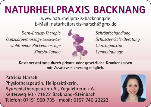 [Bitte hier klicken, um auf die neue Homepage von Naturheilpraxis Backnang weitergeleitet zu werden. Vielen Dank]